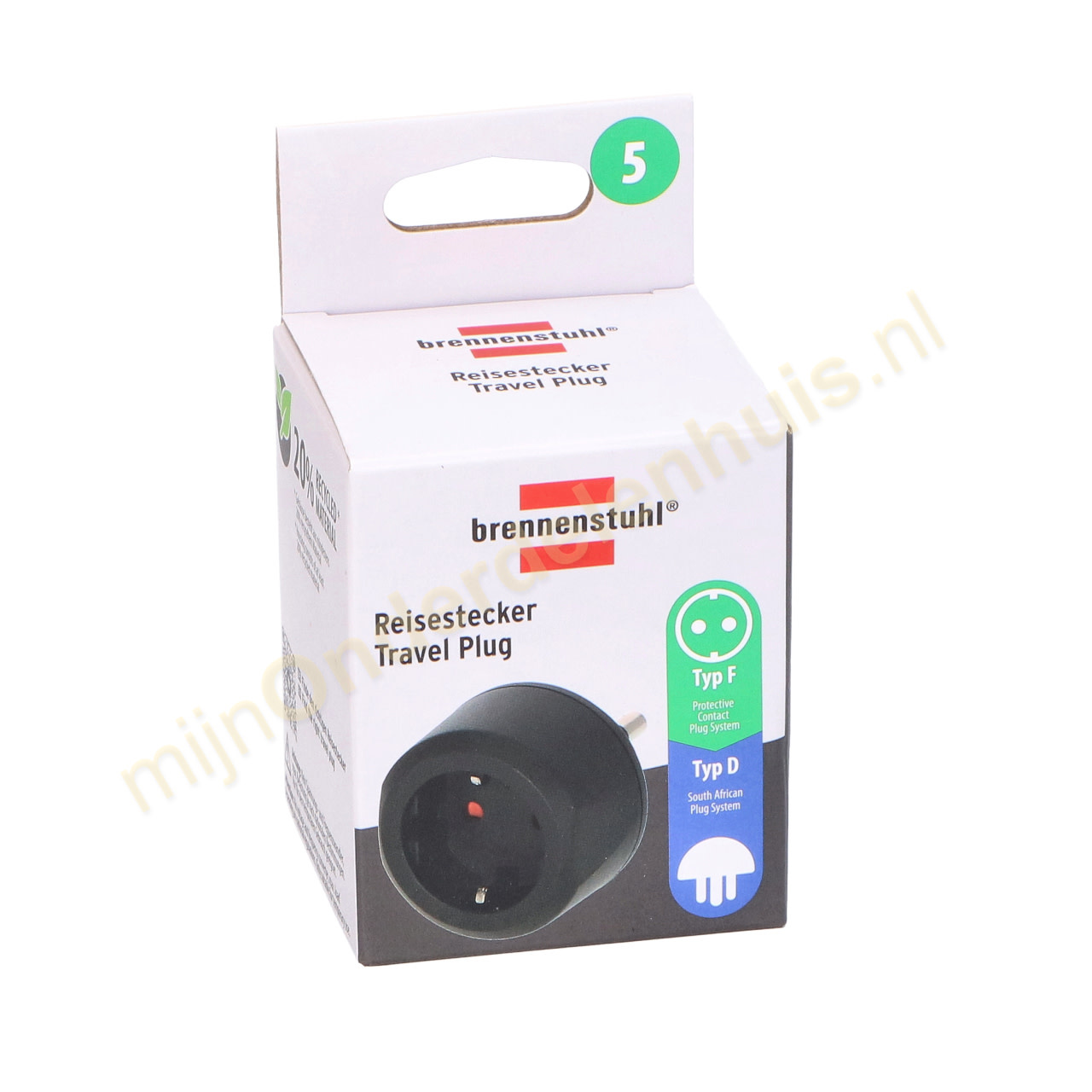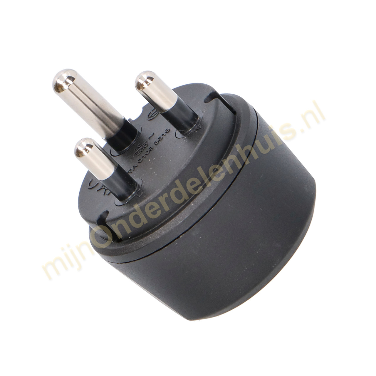 Universele reisstekker met randaarde voor gebruik in o.a. Zuid-Afrika en India.
