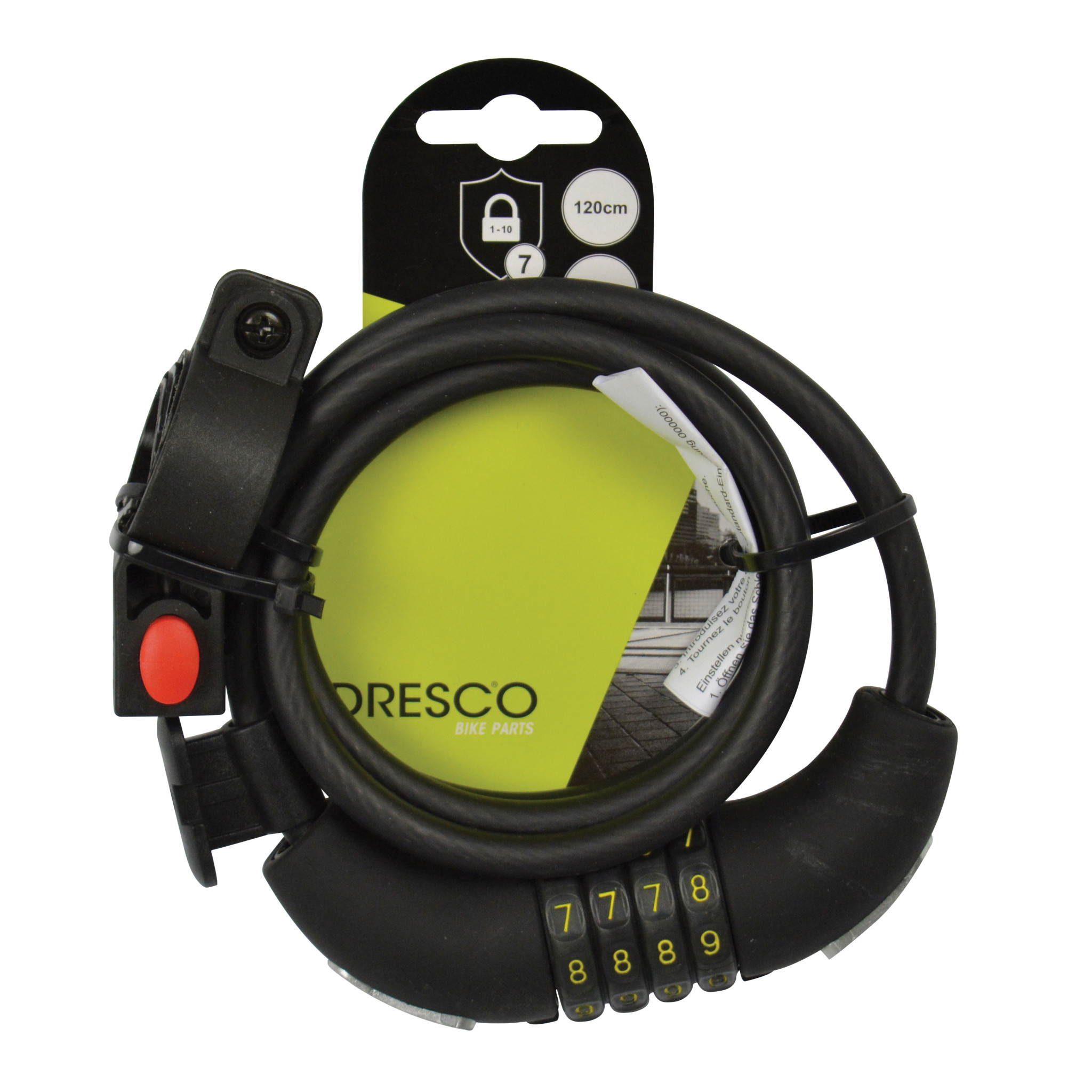Het Dresco kabelslot 120/8 is een modern, compact en flexibel kabelslot voor dagelijks gebruik en uitermate geschikt om als tweede slot te gebruiken. Het spiraalslot is te openen en op slot te zetten met de viercijferige code. Deze code is zelf snel en eenvoudig in te stellen en kan zo vaak als u dat wilt worden veranderd. Het slot heeft een lengte van 120 centimeter en heeft 8 millimeter dikke geharde kabel. Door zijn lengte zet u met dit kabelslot de fiets makkelijk vast aan een vast object. De kabel heeft een coating die zorgt voor bescherming van de fiets tegen eventuele beschadigingen. Het slot wordt geleverd inclusief houder, deze houder kan aan de zadelpen gemonteerd worden waarin het slot vastklikt.
