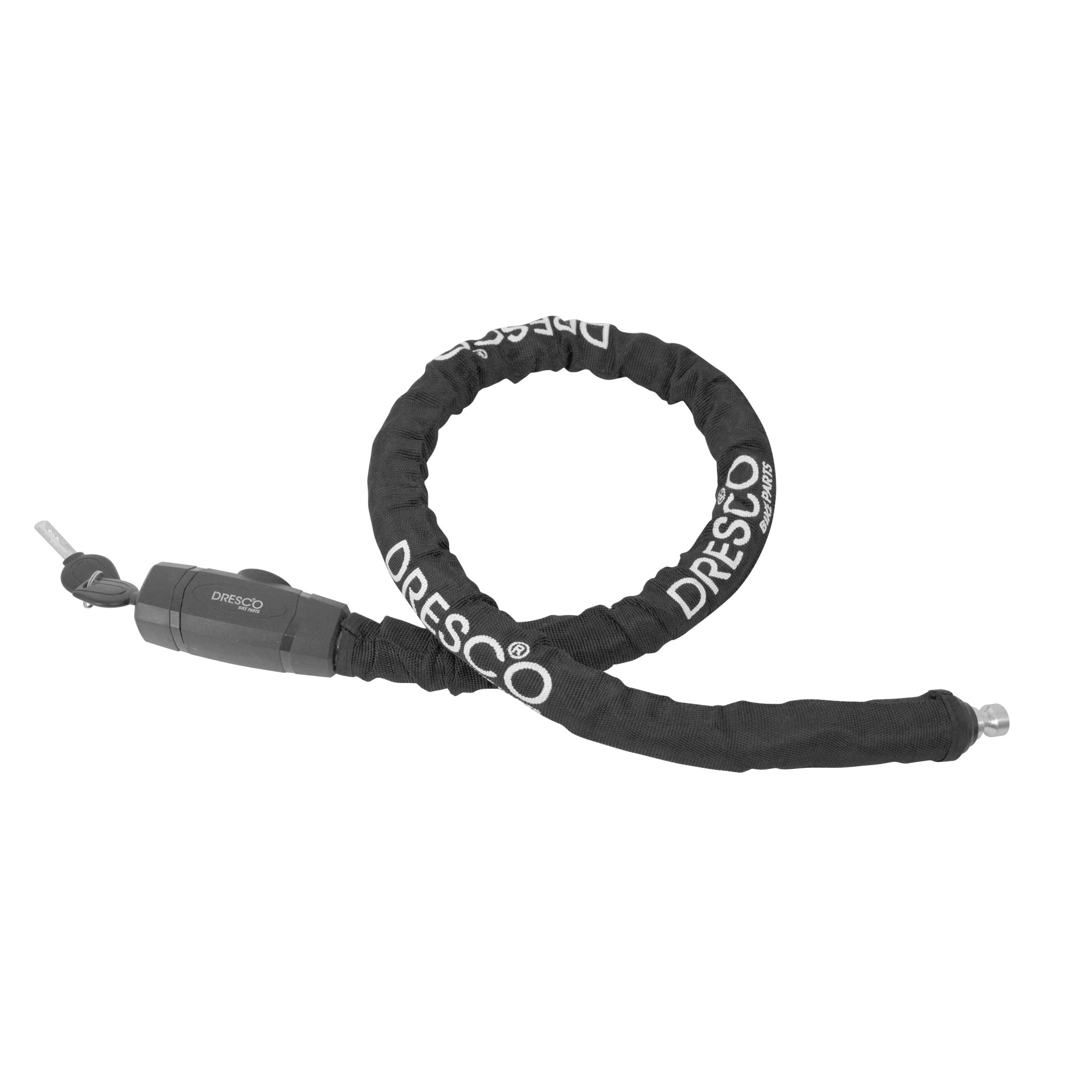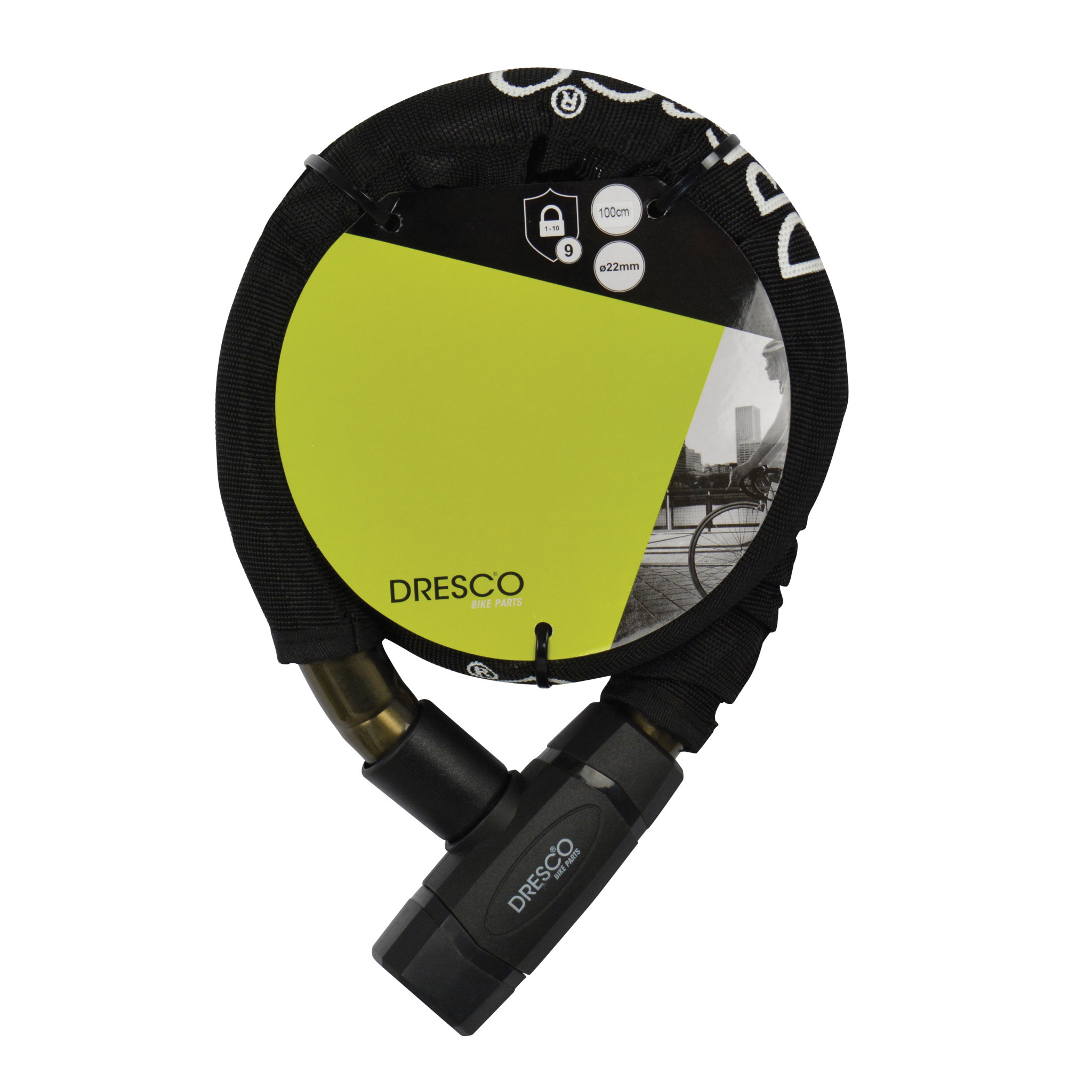 Het Dresco kabelslot is een extra stevig flexibel slot waarbij de metalen kabel van het slot voorzien is van een extra pantser. Het Dresco pantserslot met sleutel en heeft een lengte van 100 centimeter en heeft 22 millimeter dikke gepantserde kabel. De sterke kunststof coating rondom het slothuis en de polyester hoes zorgen voor bescherming van je fiets tegen eventuele beschadigingen. Het kettingslot wordt geleverd met 2 sleutels.