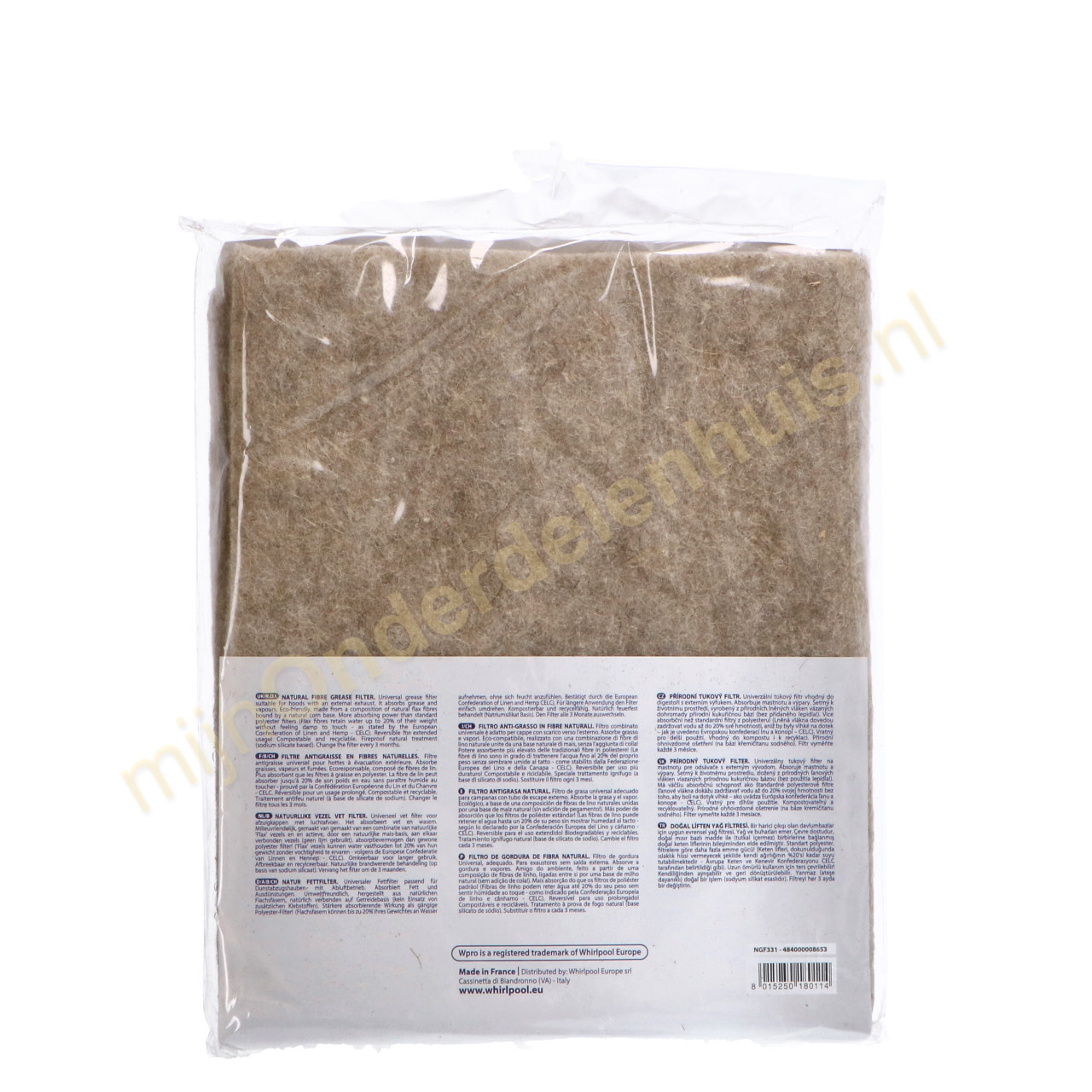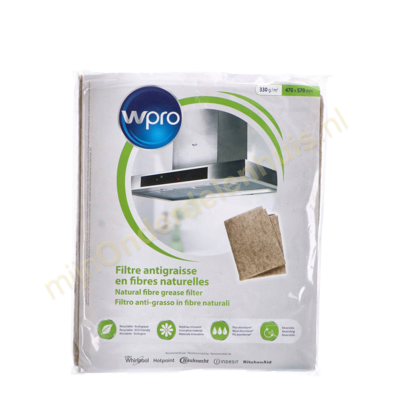 Universeel vet filter voor afzuigkappen met luchtafvoer. Het absorbeert vet en wasem. het product is milieuvriendelijk, gemaakt van een combinatie van natuurlijke 'Flax' vezels en actieve, door een natuurlijke mais-basis, aan elkaar verbonden vezels (geen lijm gebruikt). meer absorptievermogen dan gewone polyester filters! ('Flax' filter kunnen water vasthouden tot 20% van hun gewicht zonder vochtigheid te ervaren - volgens de Europese Confederatie van Linnen en Hennep - CELC). Omkeerbaar voor langer gebruik. Afbreekbaar en recyclebaar. Natuurlijke brandwerende behandeling (op basis van sodium silicaat) Vervang het filter om de 3 maanden.