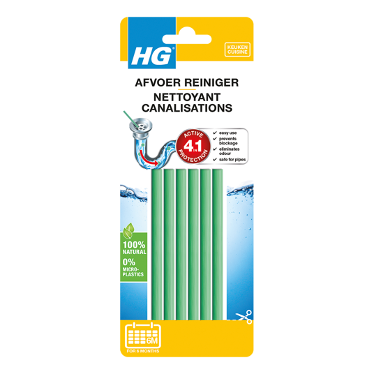 HG afvoerreiniger is ideaal om verstoppingen te voorkomen in de gootsteen in de keuken. Deze handige ontstoppersticks voorkomen niet alleen verstoppingen, maar ook vervelende luchtjes. Ze reinigen de afvoer op natuurlijke basis door middel van enzymen die etensresten oplossen. De sticks zijn biologisch afbreekbaar, bevatten geen microplastics en zijn veilig te gebruiken in de gootsteen. Elke maand een ontstopperstick en u zult geen last meer hebben van een verstopte gootsteen of vervelende luchtjes in de keuken.