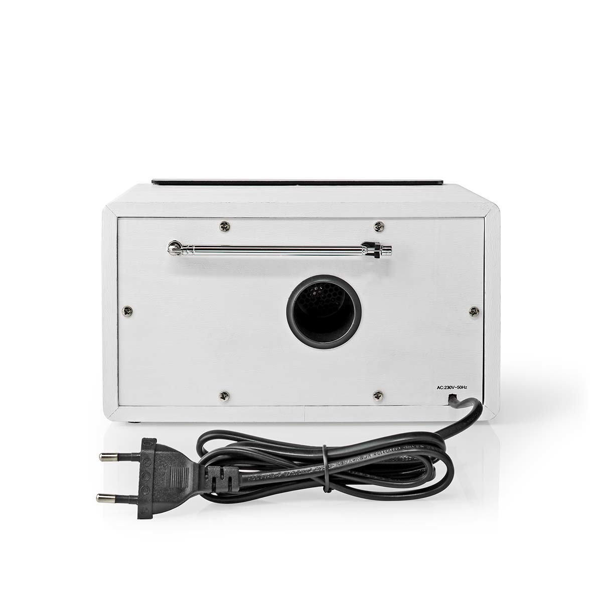 Met de bedieningsknoppen pas je het volume aan, stemt je af op verschillende frequenties en schakel je eenvoudig tussen de FM-radio en de AUX-modus. Voor de FM-radiomodus heeft het apparaat een externe antenne aan de achterkant, zodat je snel en eenvoudig op elk station kunt afstemmen.