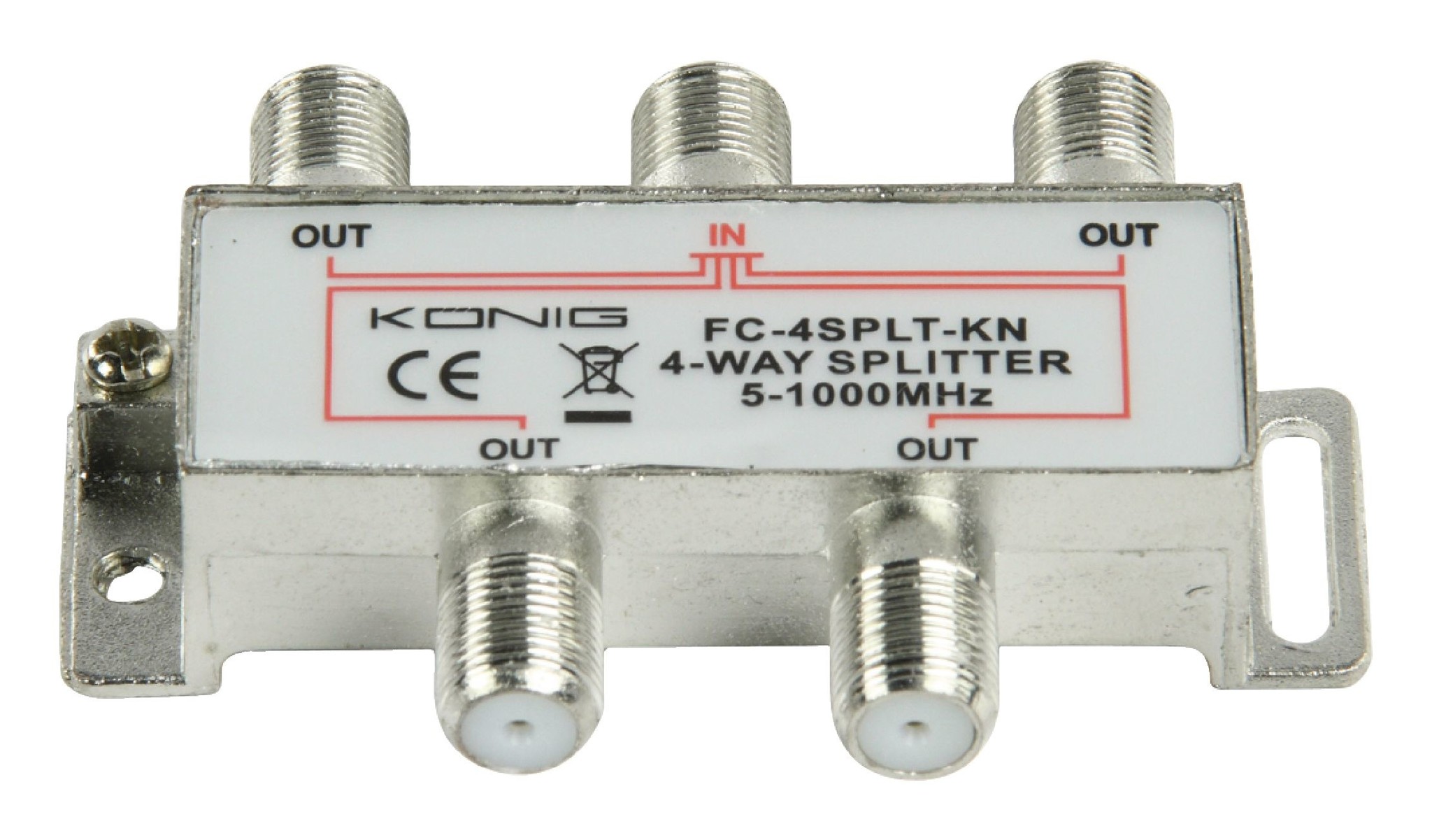 Viervoudig verdeelelement in een metalen die-cast behuizing met F-connector aansluitingen voor het verdelen van CAI signalen.