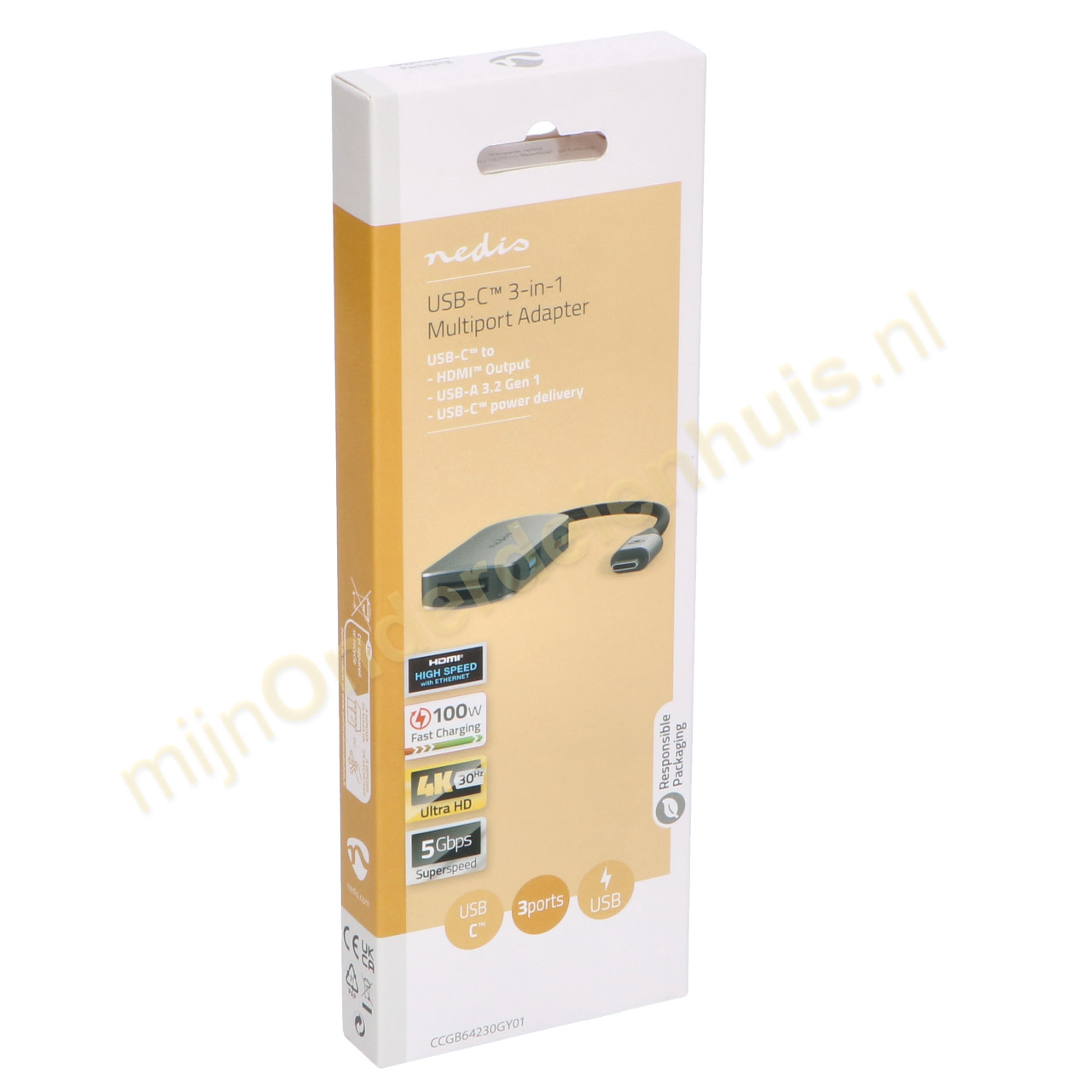 Voor snelladen is de adapter voorzien van een USB-C™ vermogensafgifte (100W) vermogen. Het kan USB-C-apparaten™ opladen, waaronder laptops, tablets en smartphones. De HDMI-poort™ ondersteunt resoluties tot UHD-4K@30Hz video-inhoud op HDTV, Monitor of projectoren.